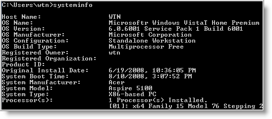 Have a need to display operating system configuration information for a local or remote machine, including service pack levels? Then systeminfo is the tool to use. When I need to connect to a system that I am not familiar with, this is the first tool I run. The output of this command gives me all the info I need including: host name, OS type, version, product ID, install date, boot time and hardware info (processor and memory). Also knowing what hot fixes are installed can be a big help when troubleshooting problems. This tool can be used to connect to a machine remotely using the following syntax: SYSTEMINFO /S system /U user